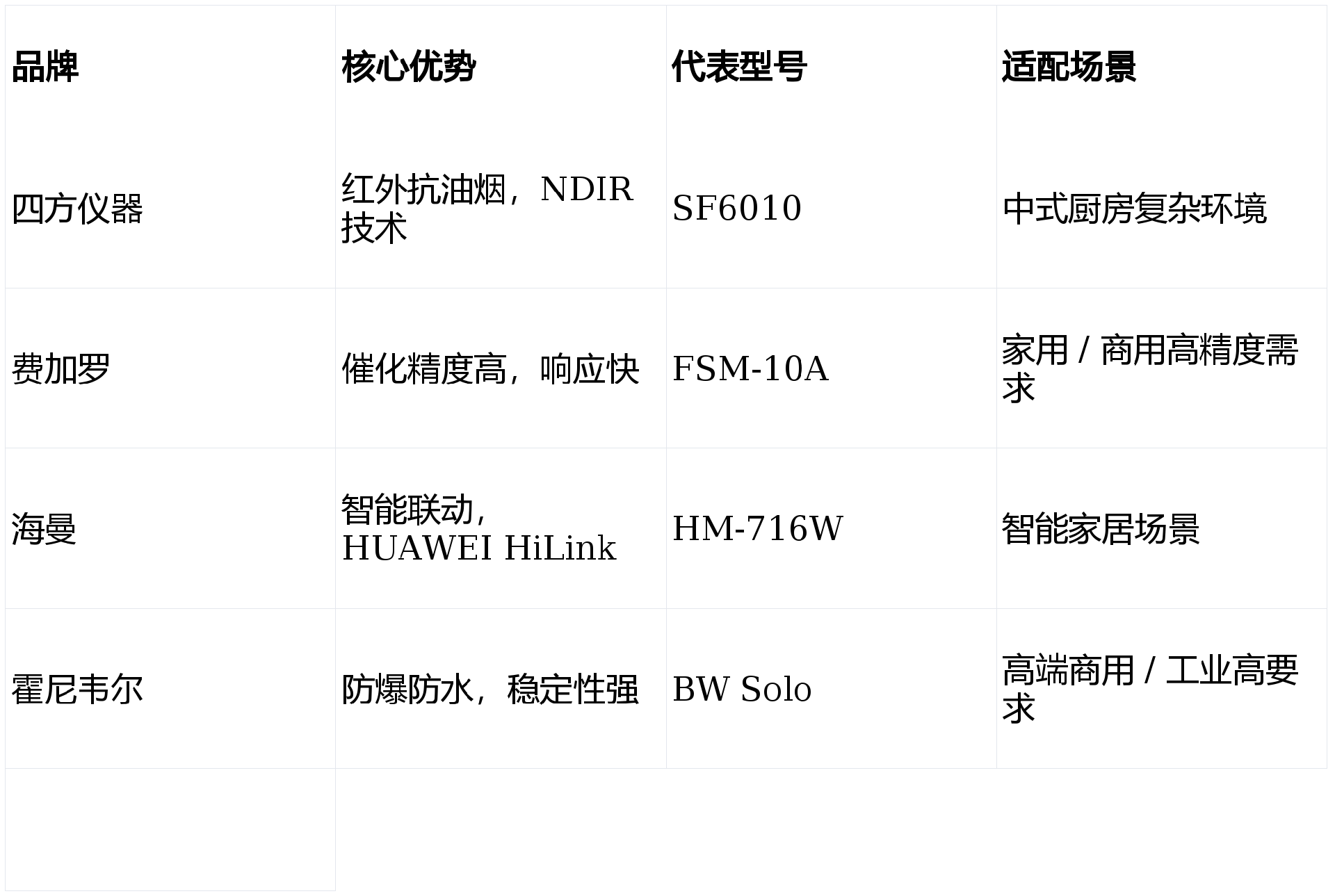 | 红外(NDIR)| 约 10 年 | 强(IP65)| 高 | 中高 | 油烟大、潮湿厨房 |