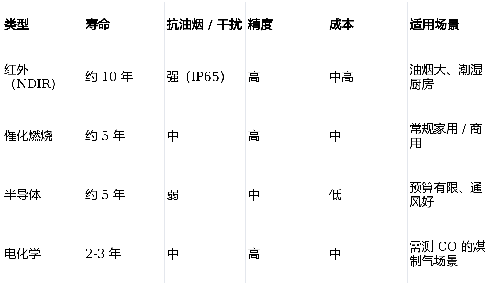 寿命更换:红外约 10 年,催化 / 半导体约 5 年,电化学 2-3 年,到期强制更换。