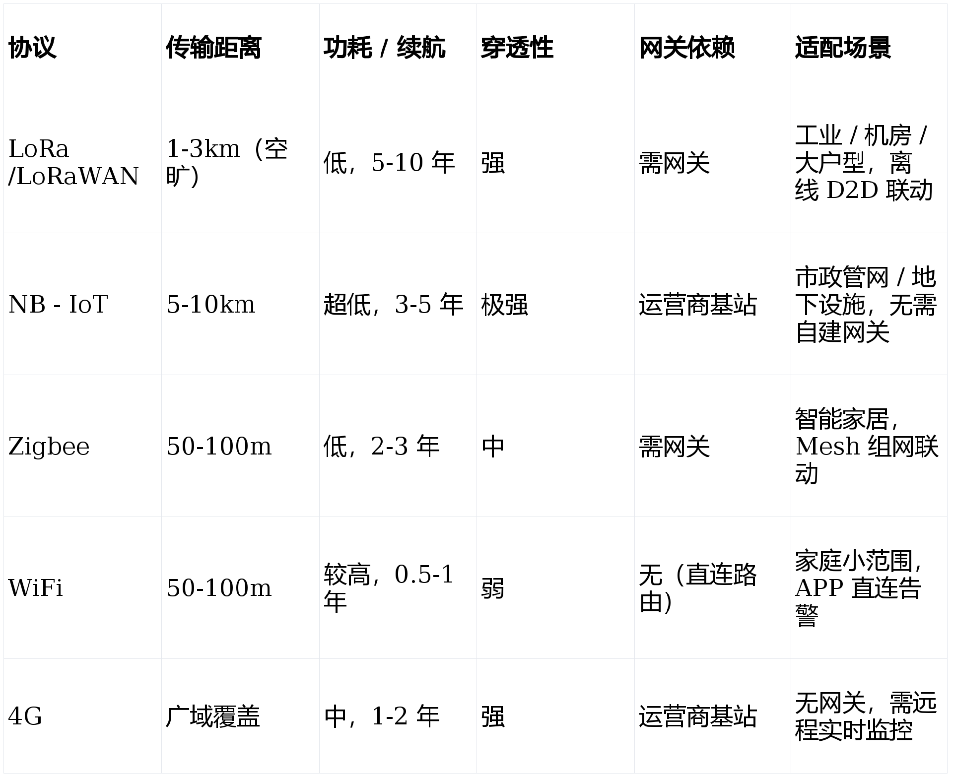 供电与续航:电池供电优先选 LoRa/NB - IoT(5 年 +);有线供电可选 WiFi/4G(实时监控)。