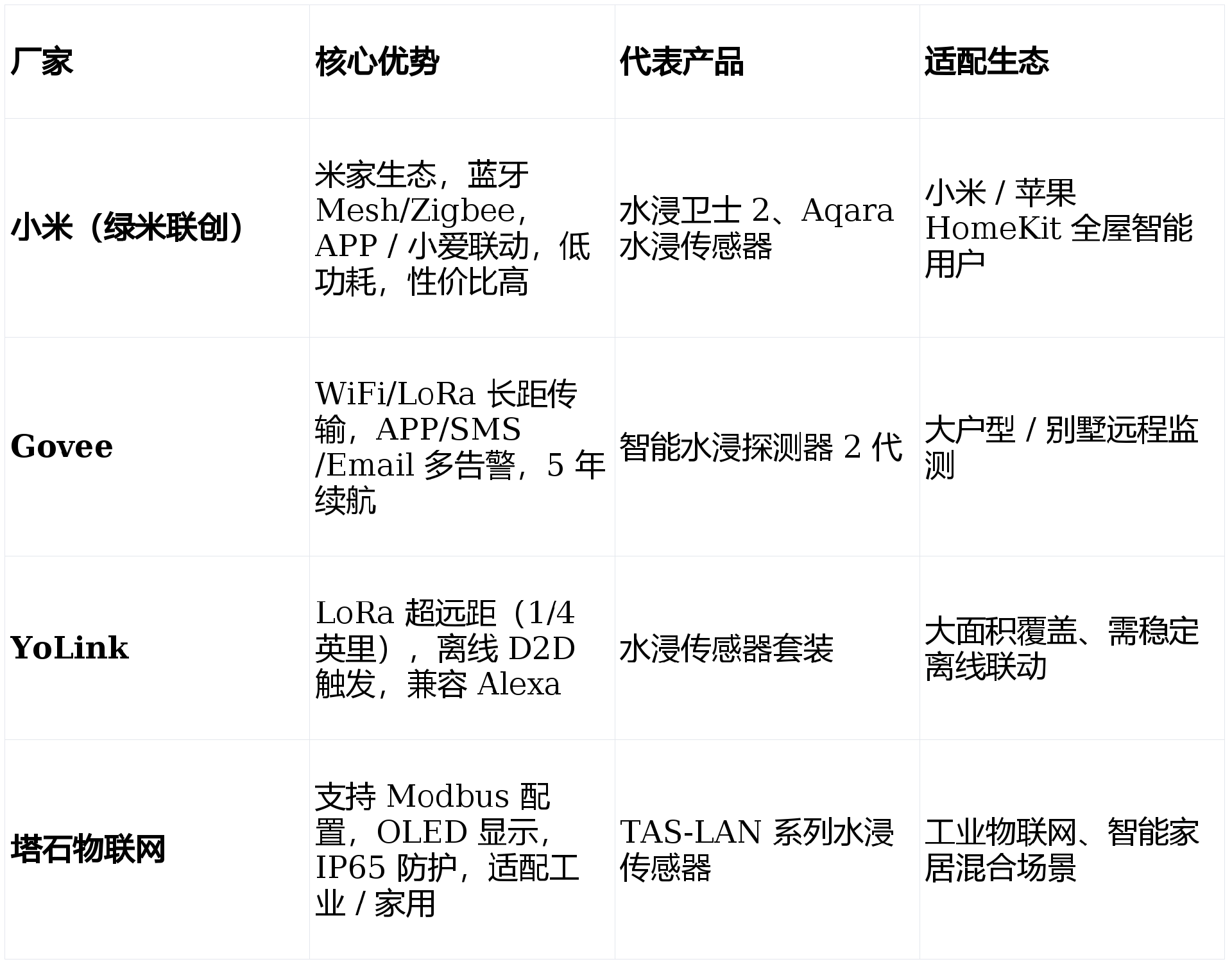 家用场景:小米 / Aqara(生态联动)、Govee/YoLink(远程告警),看无线协议(WiFi/Zigbee/LoRa)、续航能力。