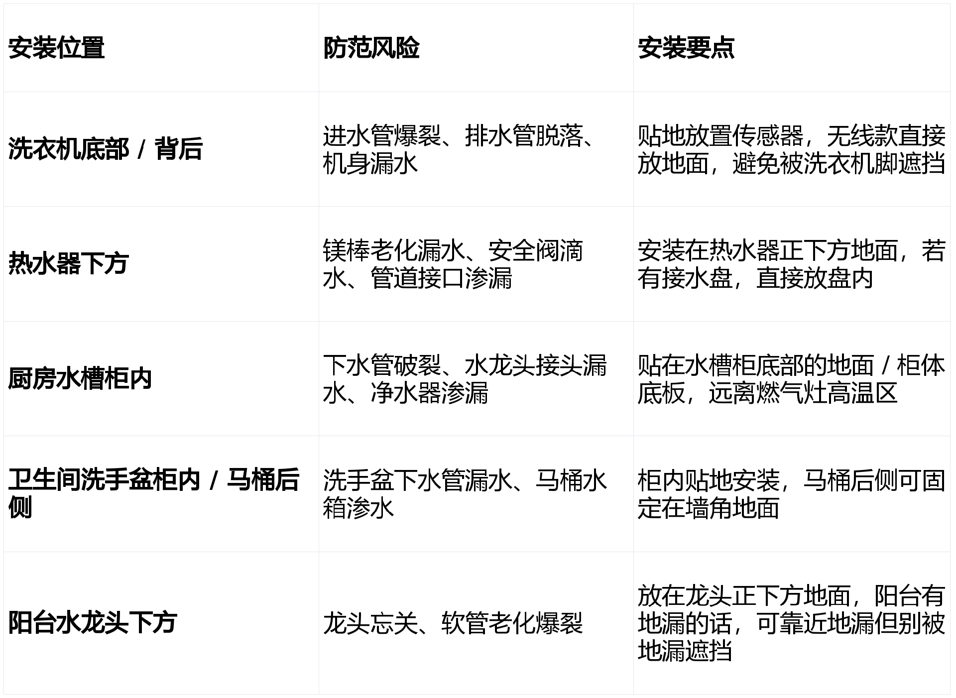 低洼优先原则:漏水会往低处流,优先装在地面低洼处、地漏附近(但别堵塞地漏)。