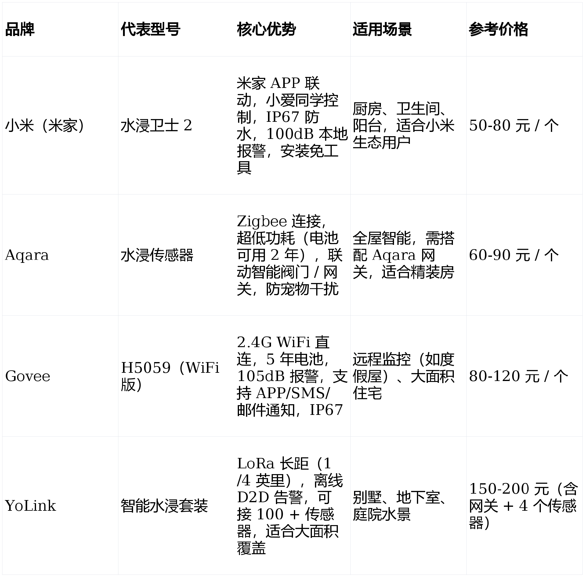 全屋智能且用 Aqara/Zigbee → 选Aqara 水浸传感器,联动更稳定;