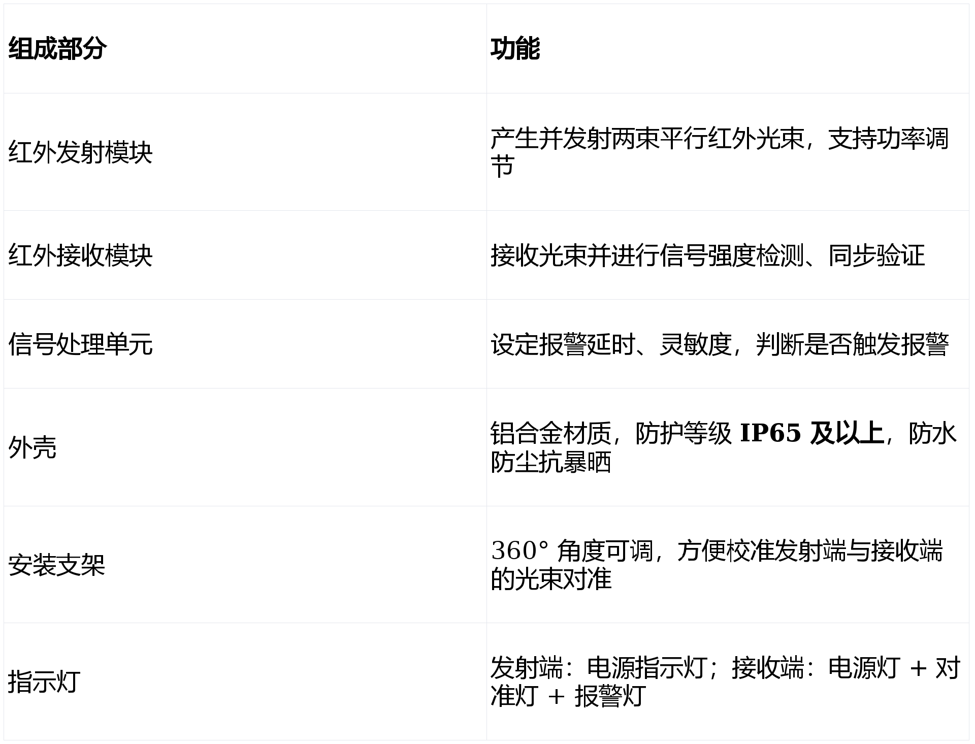 入侵状态:当人体、车辆等目标穿过警戒区域时,同时遮挡两束光束,接收端信号中断超过设定时长(一般可设 50~500ms),立即输出开关量报警信号;