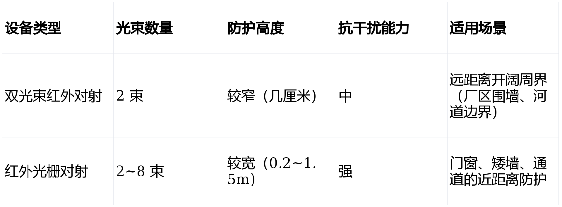 两者同属主动式红外探测器,但防护场景和抗干扰能力有差异: